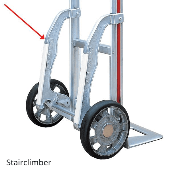 The hand truck has a square loop handle with a comfortable foam grip (No. 28) and a deep die cast nose (HM). The Magliner can be supplied with standard pneumatic or puncture proof (foam filled) wheels. We also recommend the optional curb & stair-climbing skids.
