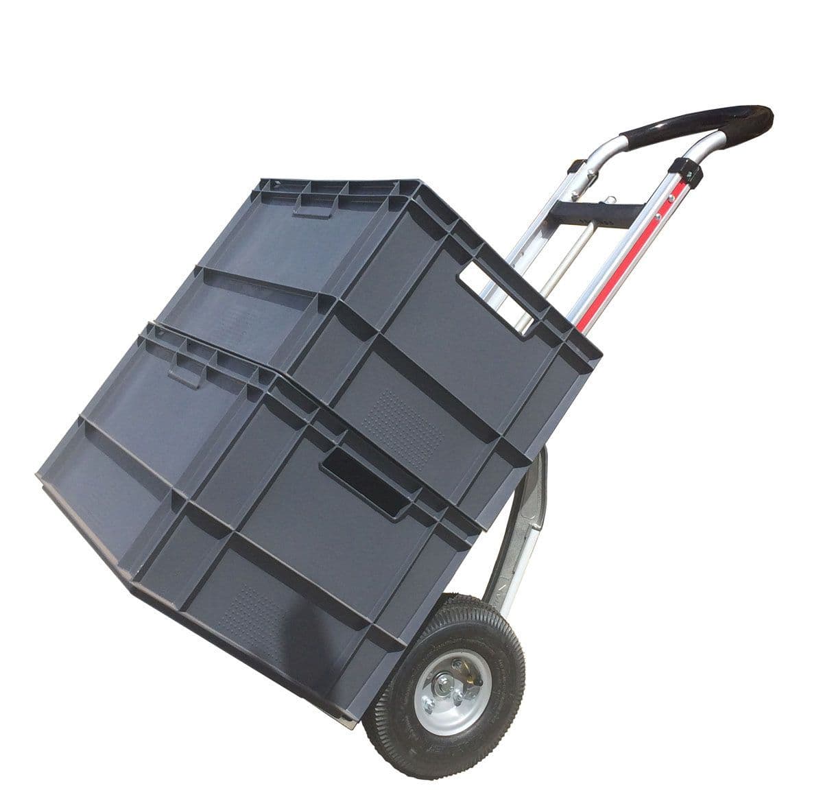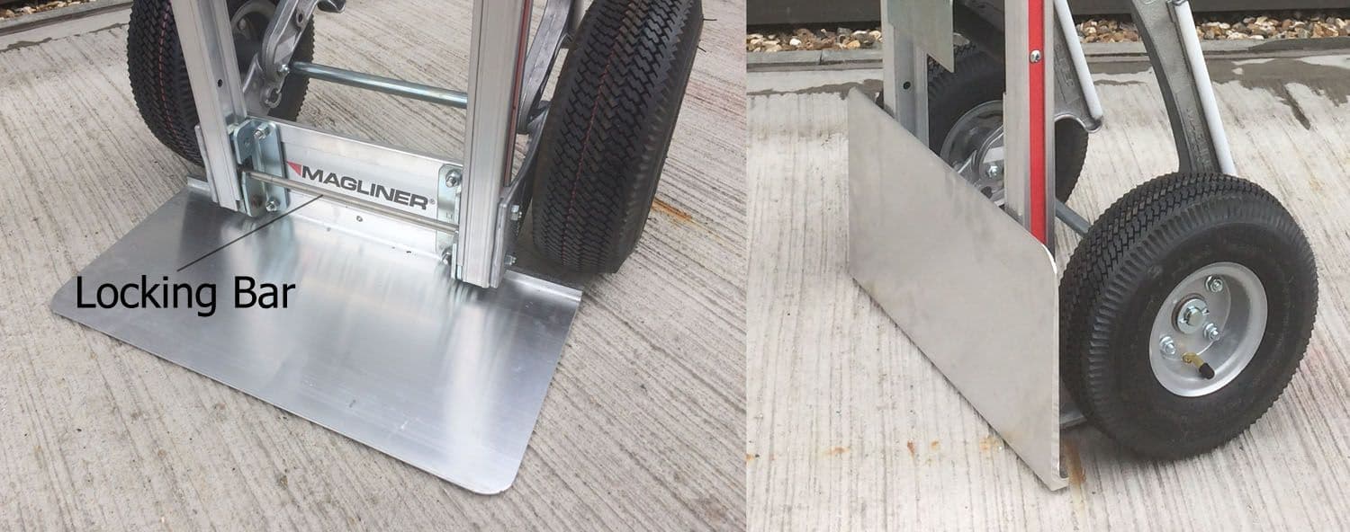 This Magliner uses the straight back aluminium frame with shock resistant polymer vertical straps (No. 4), loop handle covered in vinyl (No. 19), and is fitted with a folding 455 x 230 mm extruded alumimium folding toe (G1). Pneumatic wheels are supplied as standard but you can choose other if you prefer. This hand truck is also fittted with a stairclimbing accessory to help go up curbs or short flights of stairs into buildings for example.
