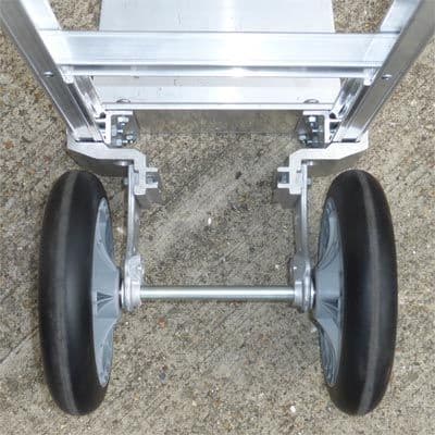 Narrow Aisle Magliner Hand Trucks are designed with the wheels tucked fully or partially behind the truck’s frame enabling great manoeuvrability in confined spaces due to the truck’s narrower width.This model uses the straight back aluminium frame (no. 1), a Loop handle with a vinyl cover (no. 19), 300 x 300 x 260mm extruded aluminium tapered nose (T1), and 10” x 2.75” puncture proof microcellular foam wheels (No. 1075).